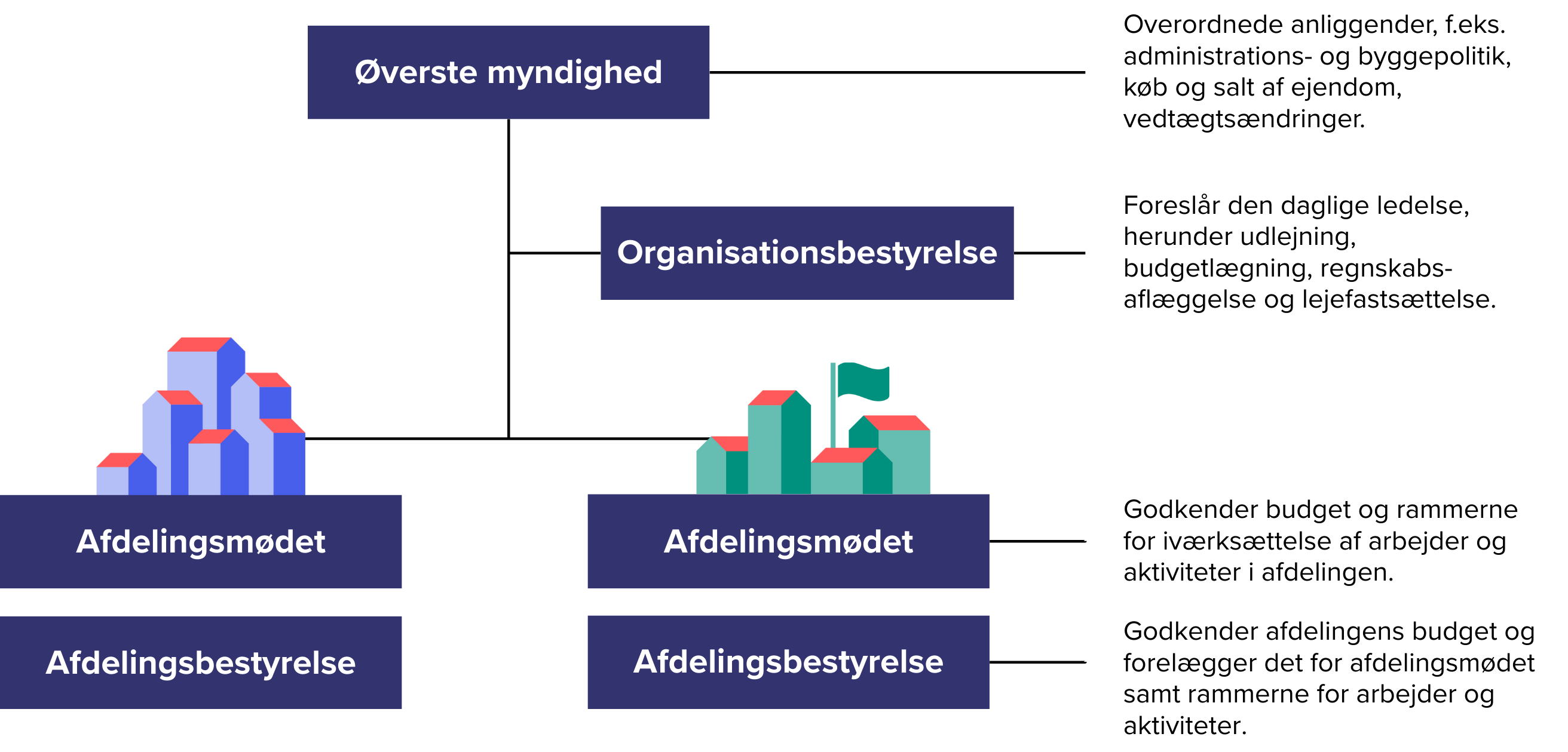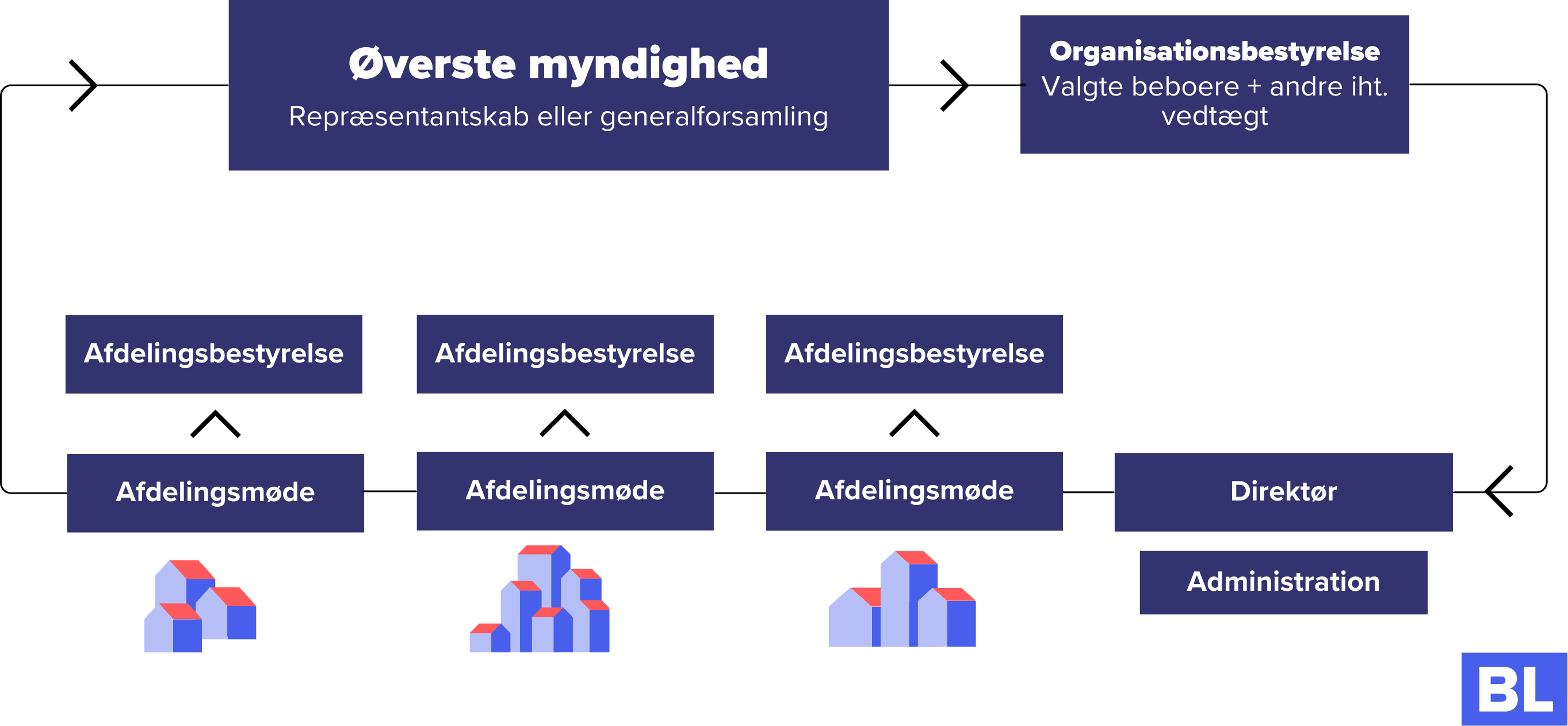 - Repræsentantskab – består af boligorganisationens bestyrelse
