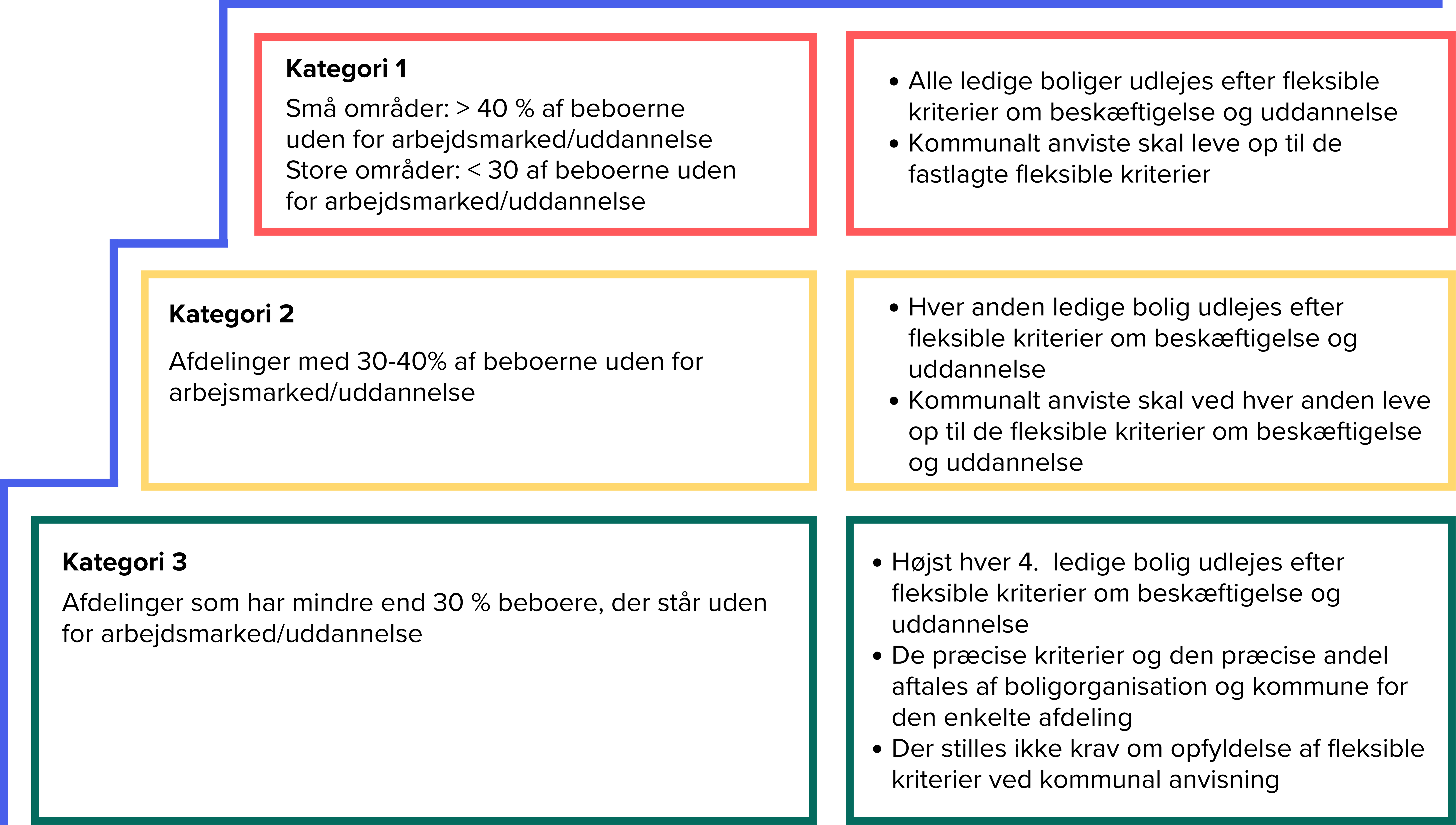 - Særlige fleksible kriterier kan indføres i boligafdelinger, hvor nøgletal viser særlige problemstillinger. Efter aftale mellem de berørte boligorganisationer og kommunen, fx i afdelinger, som har en høj andel af beboere med dom. Her kan der opstilles krav om, at tilflyttere ikke må have modtaget en dom inden for de seneste to år.